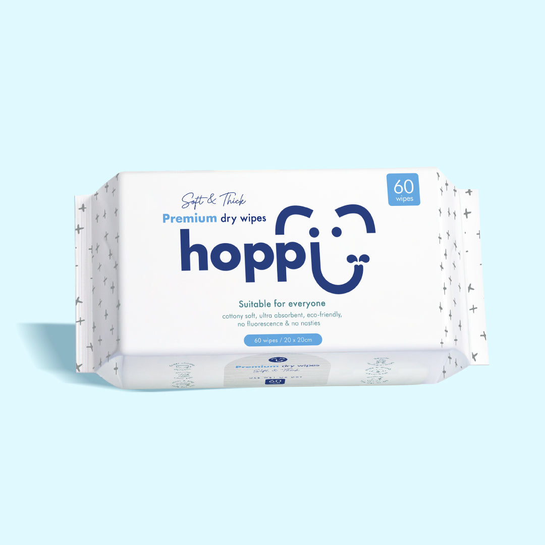 With improved thickness to 80gsm, 33% larger size, and an ultra-soft dual-texture design, Hoppi dry wipes are now in a league of their own.